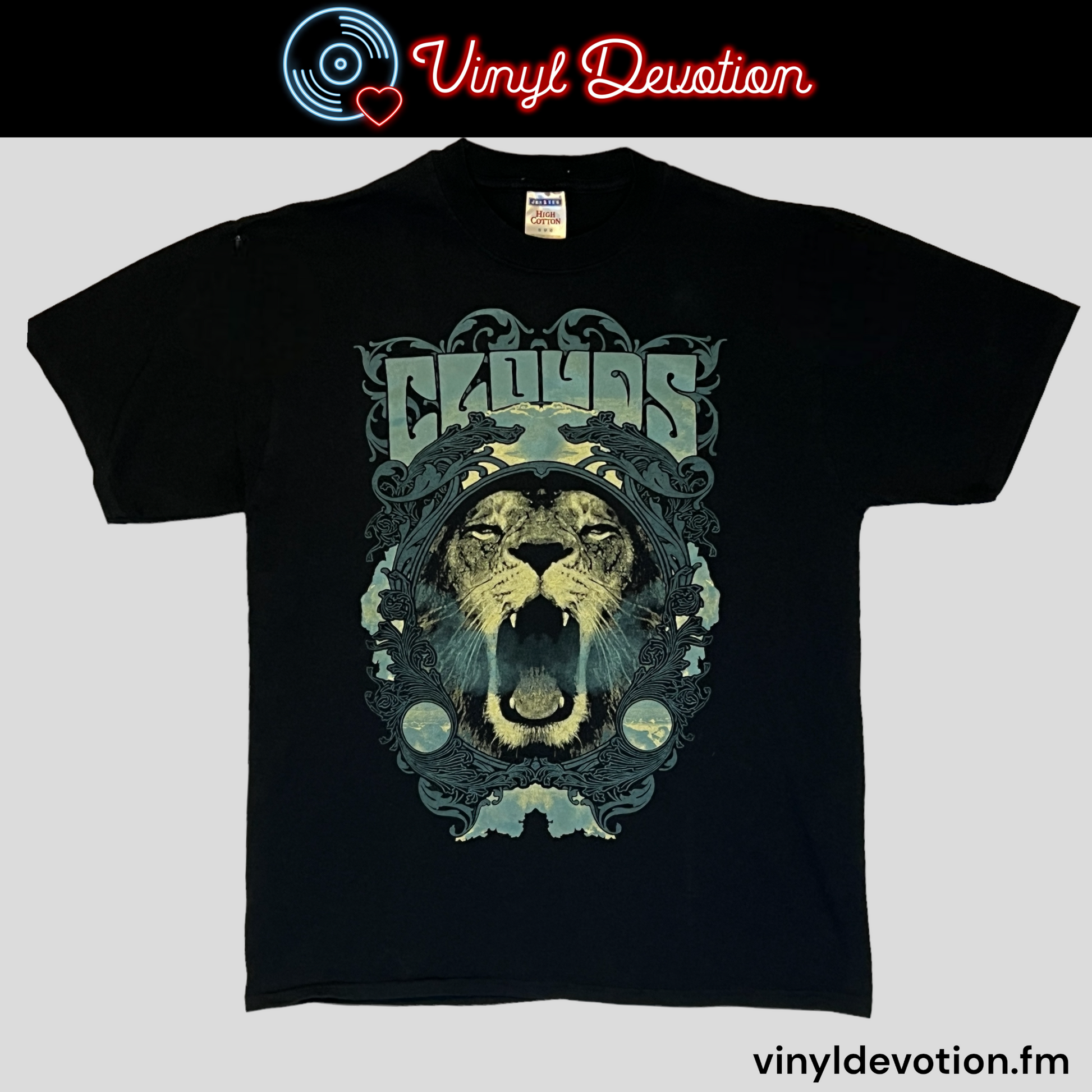 Shirt from the band Clouds, featuring members from Cave In, Converge and The Hope Conspiracy. This shirt is preowned and may show signs of light wear. Please refer to the sizes below.