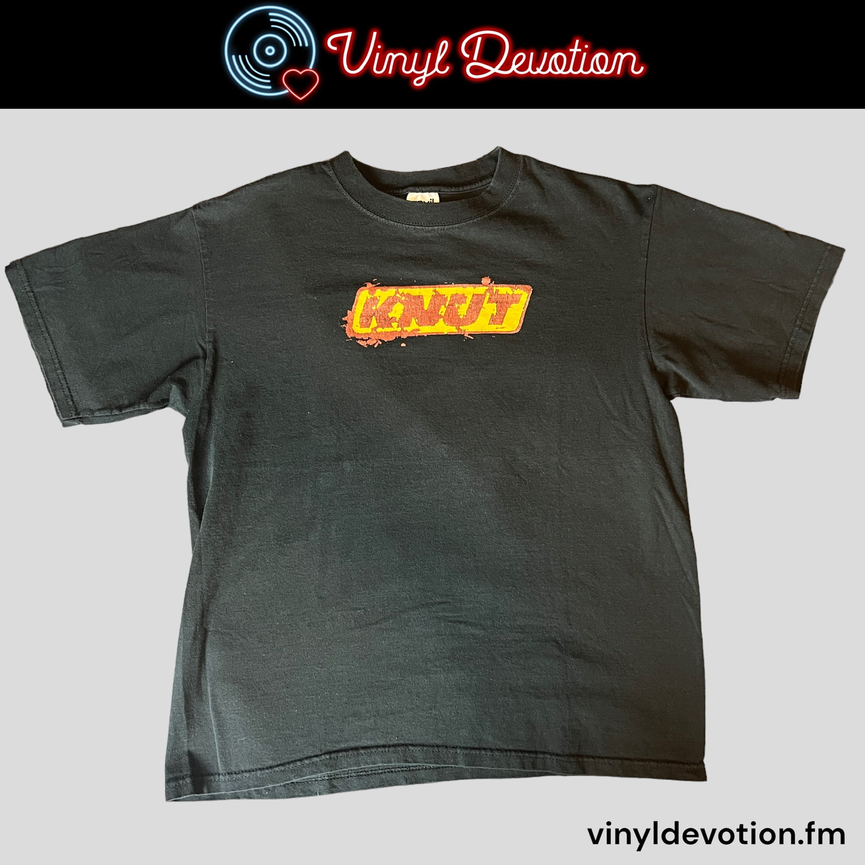 Shirt from the band Knut. This shirt is preowned and may show signs of light wear. Please refer to the sizes below.