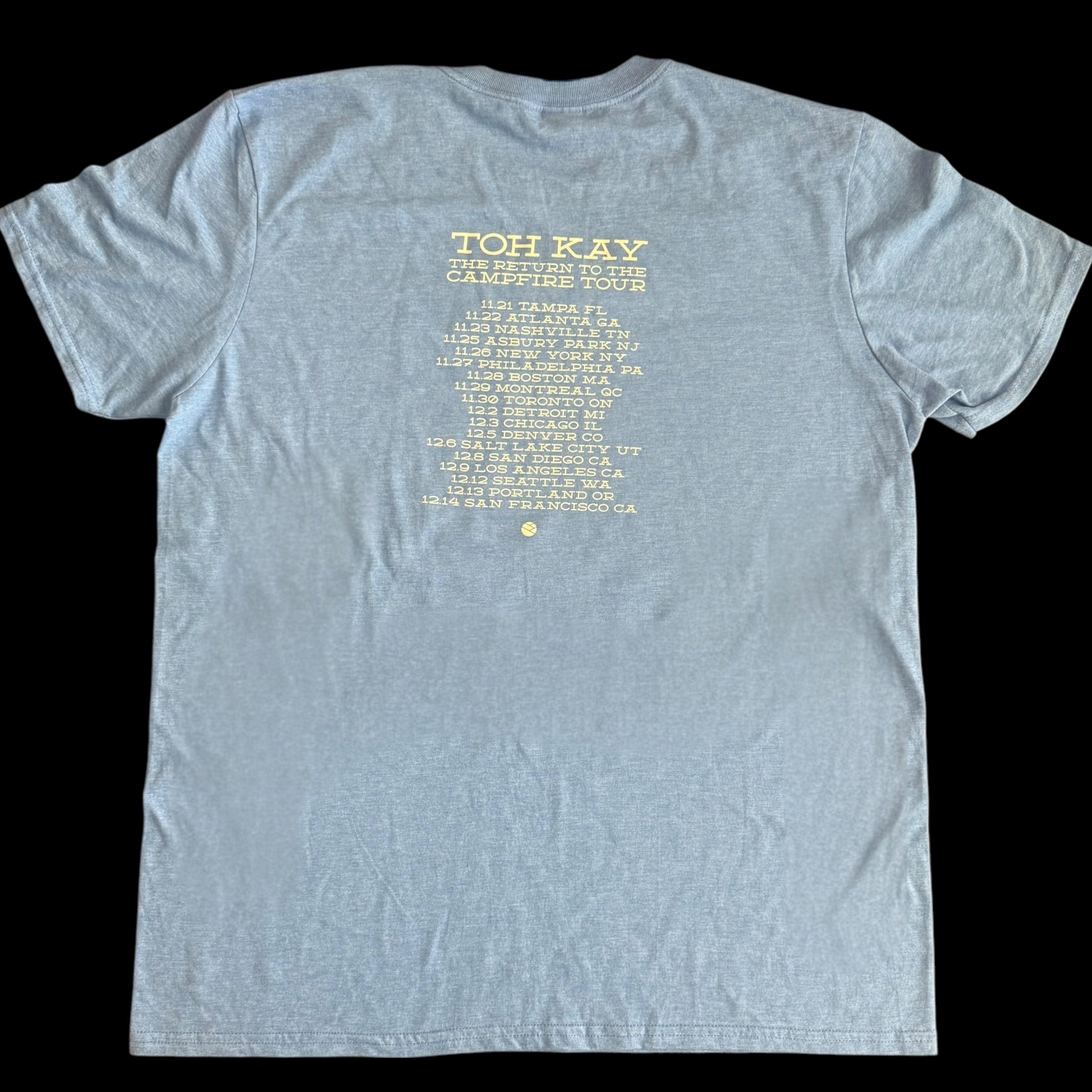 Shirt for the folk / acoustic band Toh Kay for their 2016 tour Return To Campfire. This shirt is preowned and may show signs of light wear. Please refer to the sizes below.