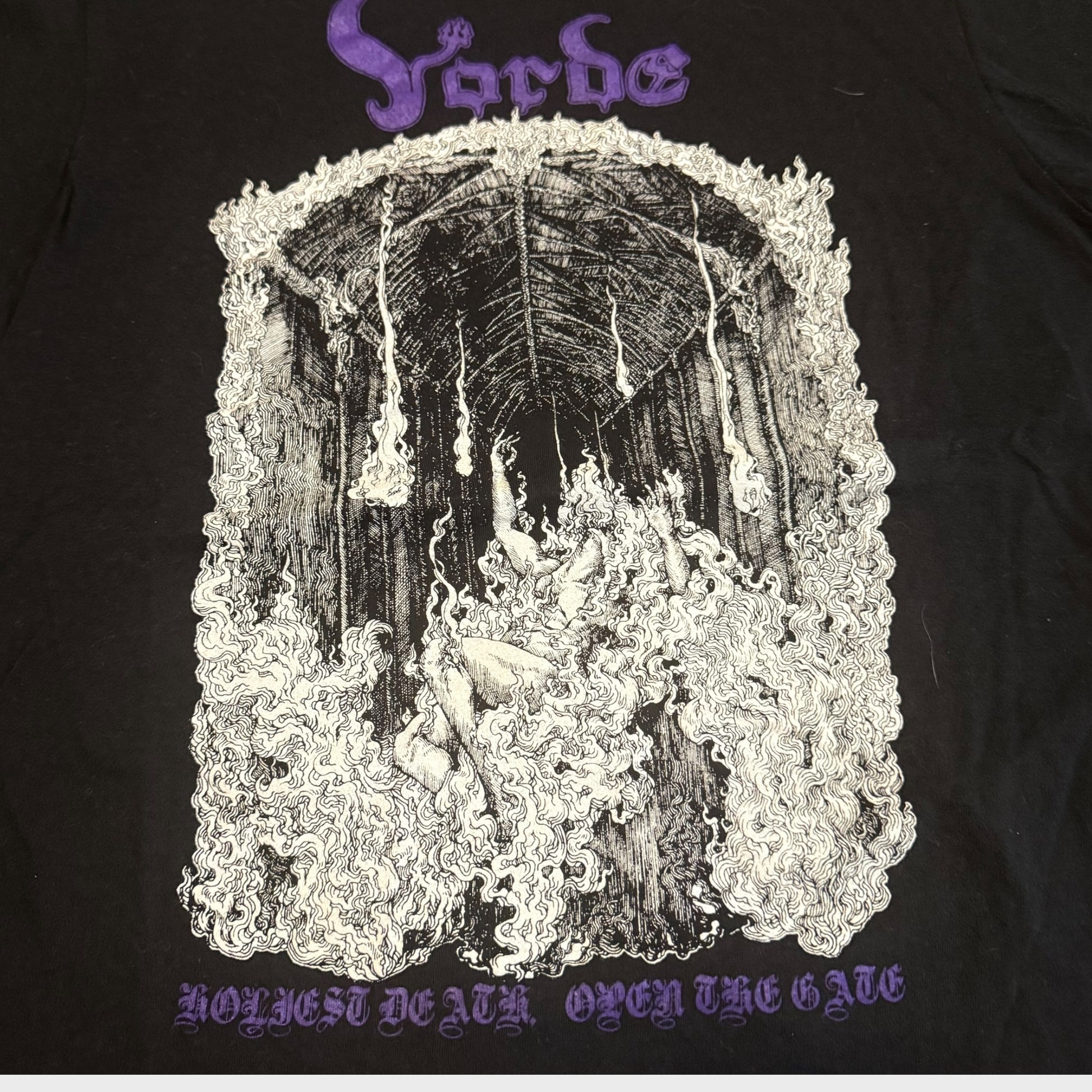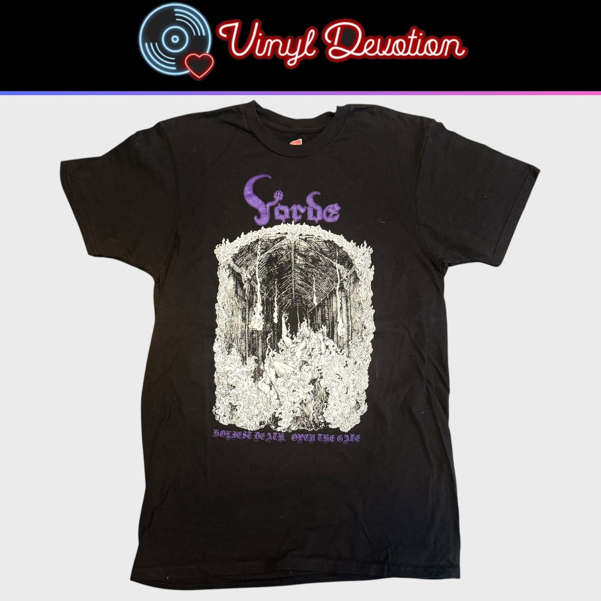 Shirt from the black metal band Vorde. This shirt is preowned and may show signs of light wear. Missing tag, please refer to the sizes below.